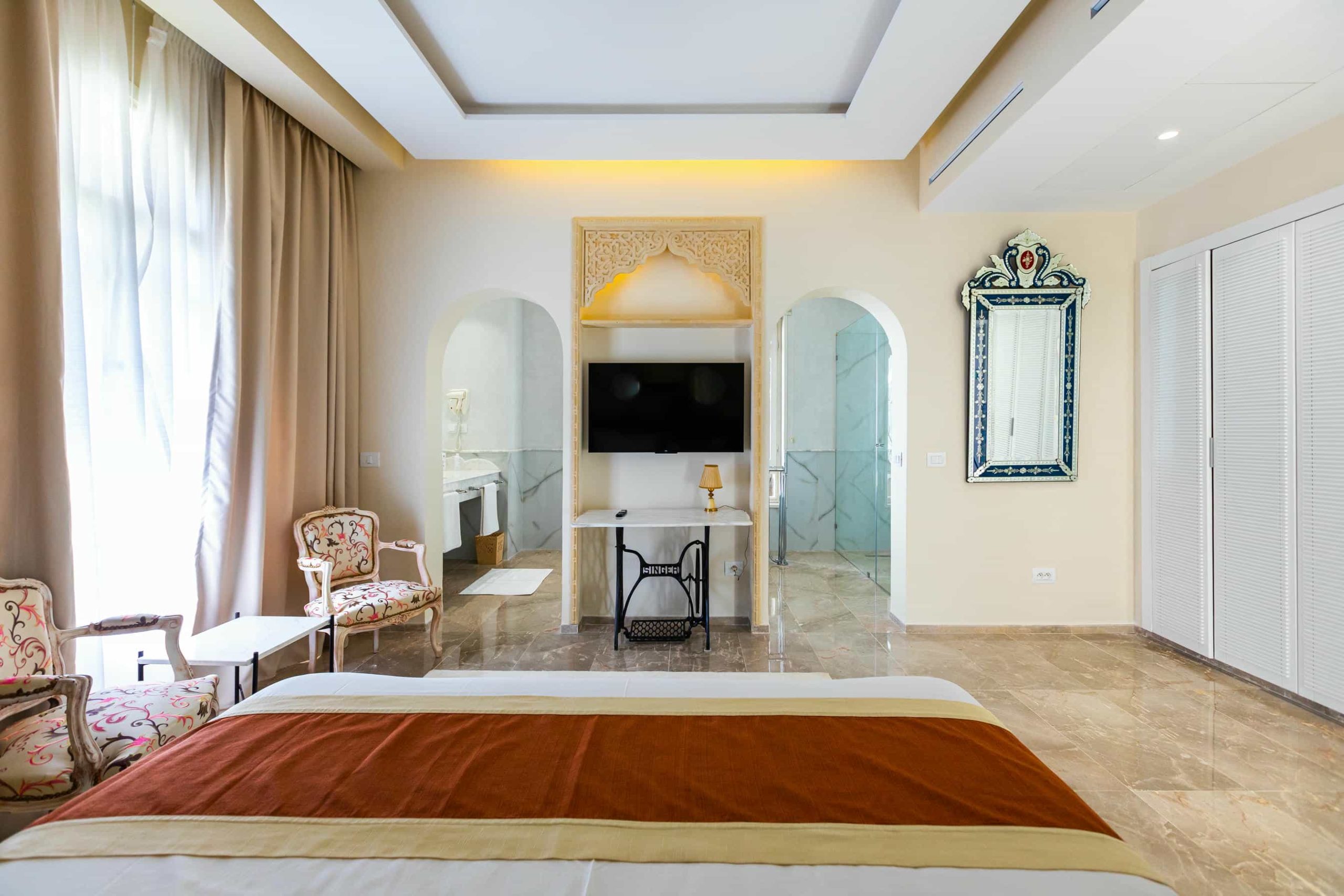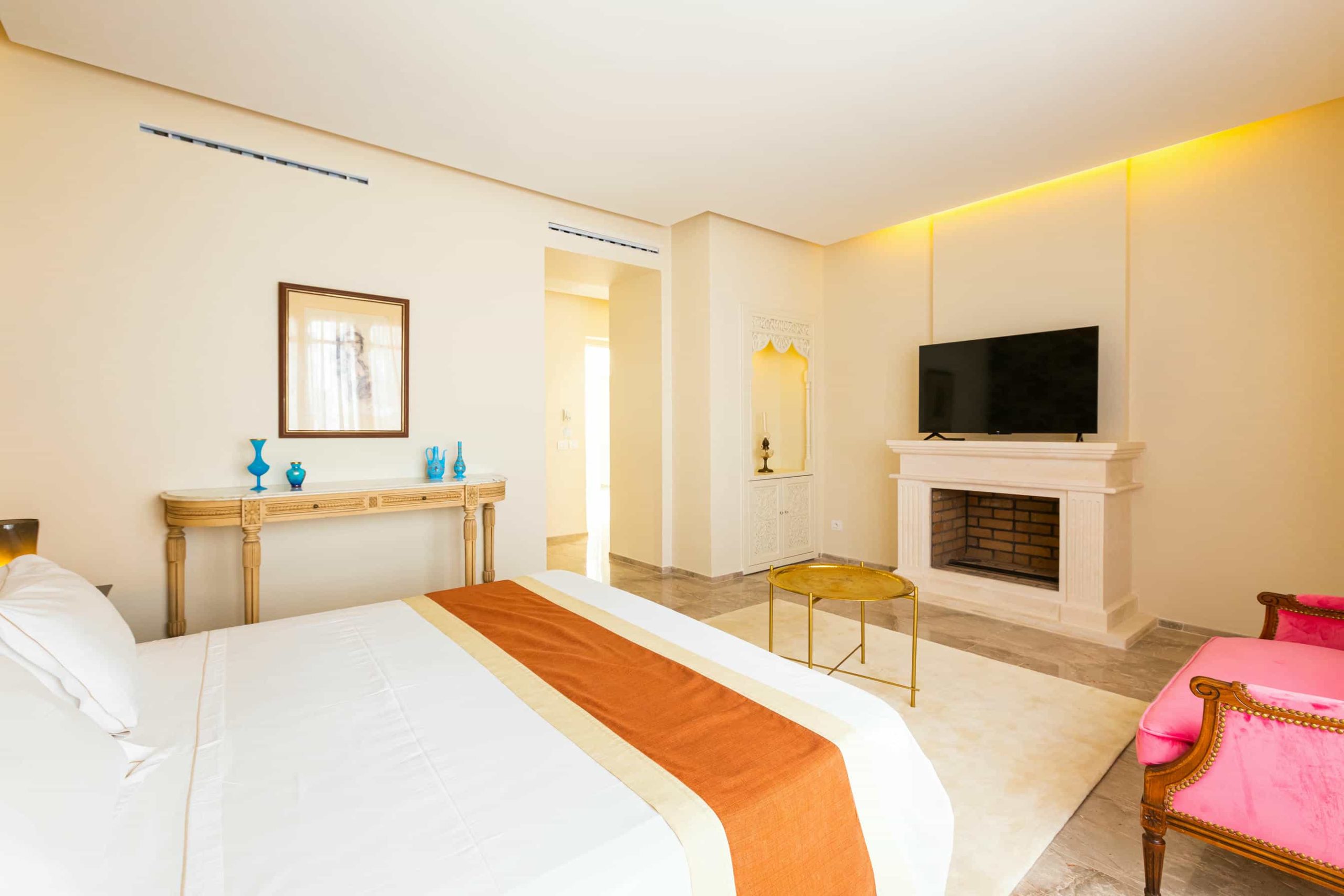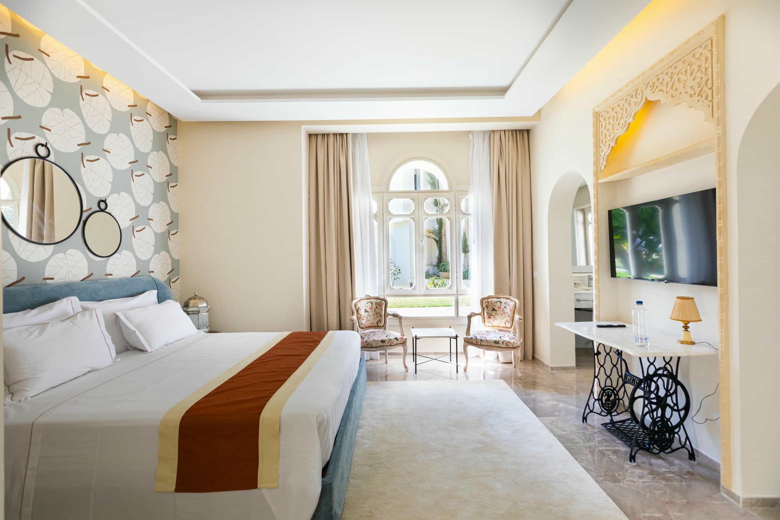 Nos Suites Junior sont conçues pour les clients qui apprécient l’espace et l’élégance. Chaque suite, qu’il s’agisse de Misk Ellil, Sawsen, Kamilia ou bien Yakouta, est décorée en hommage à sa fleur spécifique. Les motifs délicats et les couleurs soigneusement choisies créent une ambiance apaisante parfaite pour un séjour prolongé ou une occasion spéciale.
